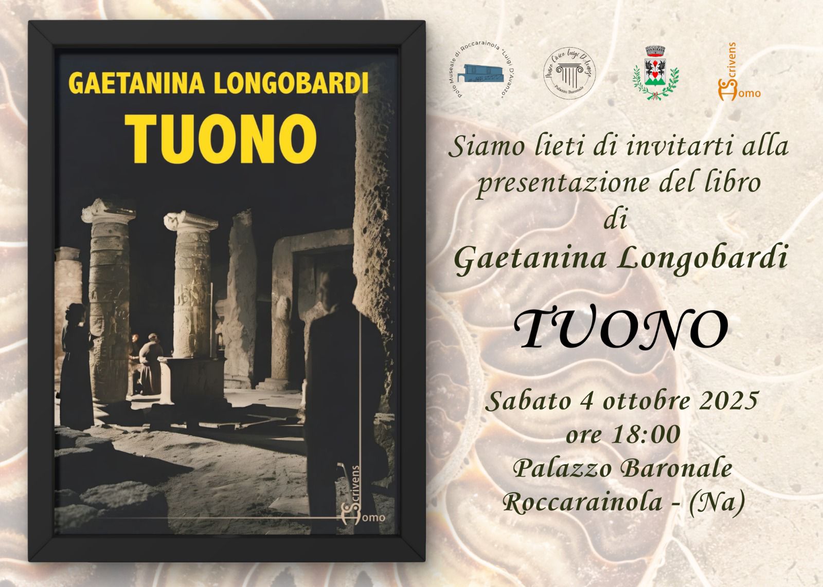 Vi Aspettiamo sabato 4 ottobre alle ore 18:00 presso il Palazzo Baronale per la presentazione del libro "Tuono" di Gaetanina Longobardi. Un romanzo rosa che si tinge di nero e getta luce sul misterioso mondo dei tombaroli, tra Pompei e Paestum. Una guida turistica del Cilento s'imbatte fortuitamente in un tombarolo e resta coinvolta in una serie di avventure e colpi di scena che la sospingono nel mondo illegale, ma al tempo stesso affascinante, dei cercatori di antichi reperti, qui ricostruito con cura. Attratta da quell'uomo, comprende presto che la ricerca di antichi oggetti preziosi è per loro anche occasione di scavo interiore, tra pulsioni sensuali e bisogno d'amore più profondo. (HOMO SCRIVENS EDITORE)